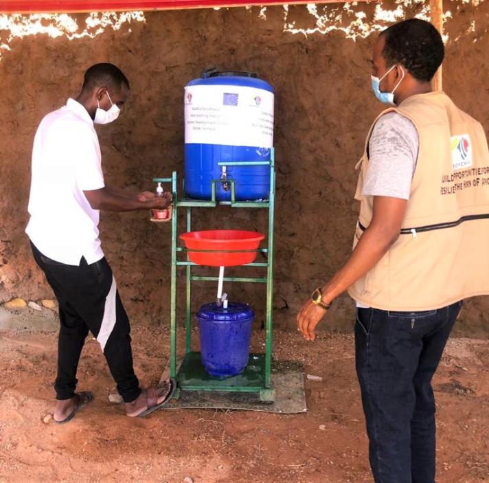 Abdikadir Adan in the process of making a handwashing station. Dollow, Somalia. April 2020.